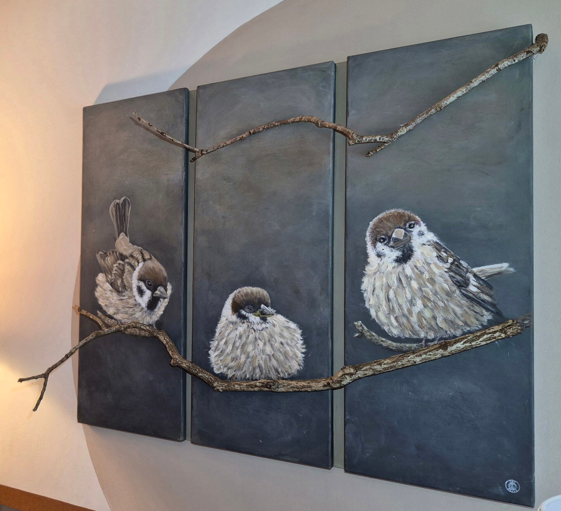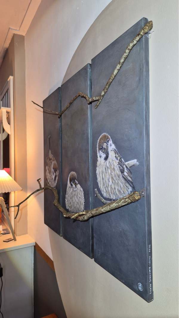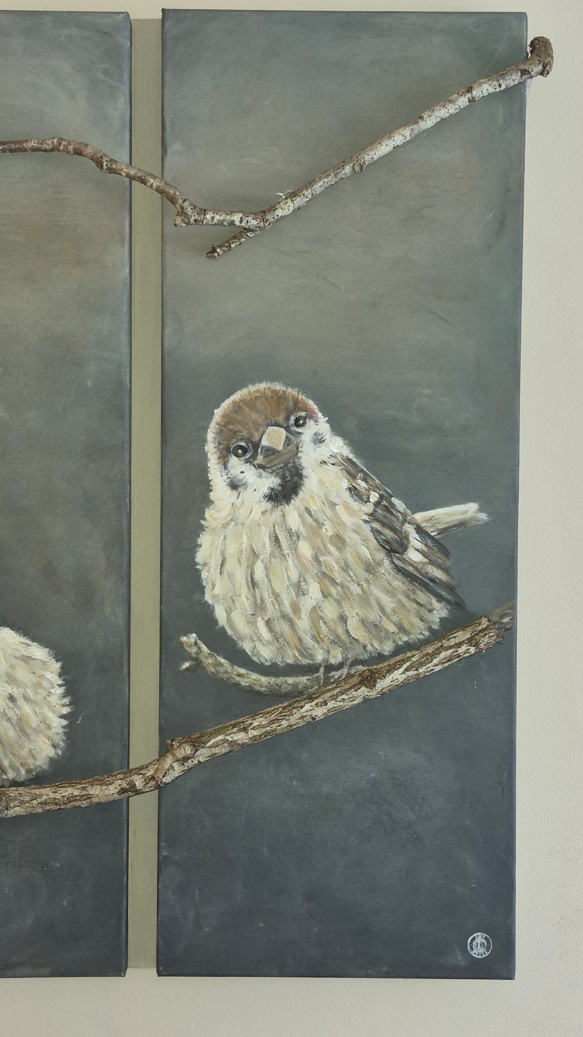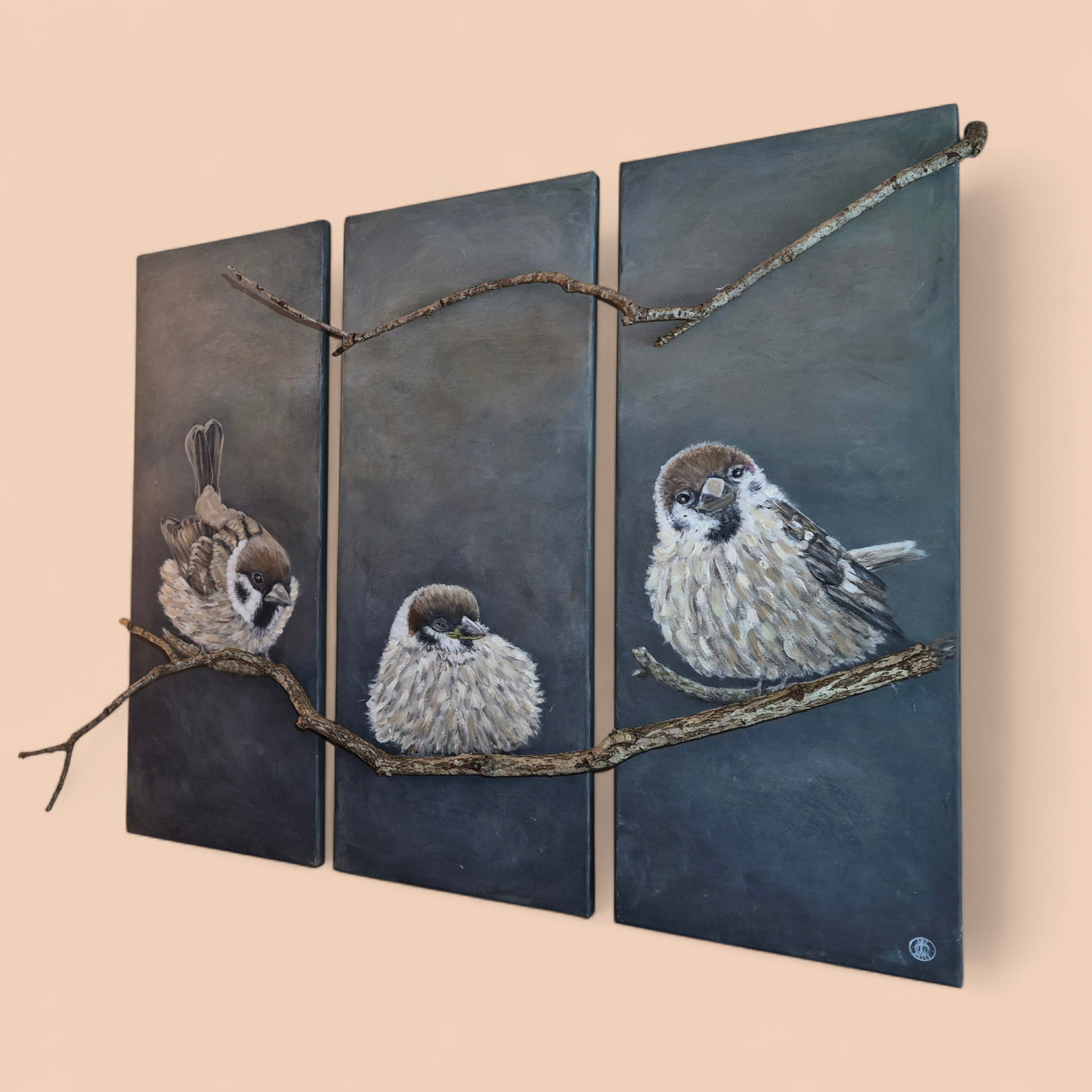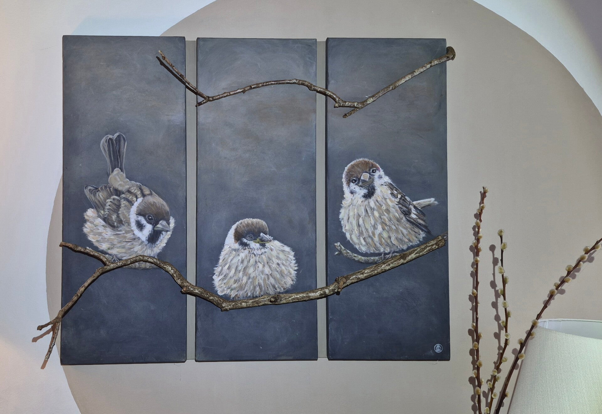 Drieluik met 3 verschillende musjes, samen op een (echte!) tak.
